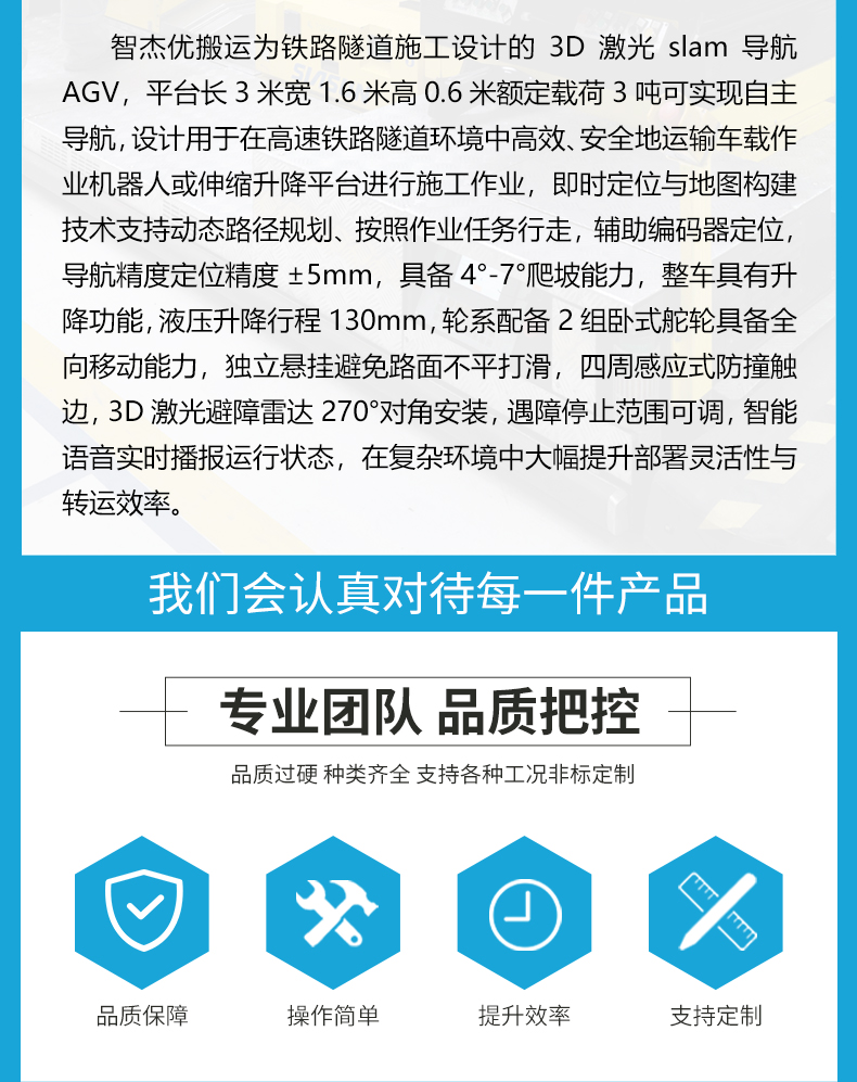 描   述: 3D激光SLAM導(dǎo)航AGV用于隧道內(nèi)運(yùn)輸車載作業(yè)機(jī)器人或升降平臺(tái)進(jìn)行施工作業(yè)。采用3D激光slam即時(shí)定位與地圖構(gòu)建導(dǎo)航技術(shù),結(jié)合編碼器輔助定位,導(dǎo)航精度定位精度±5mm,靜態(tài)環(huán)境、動(dòng)態(tài)場景都能實(shí)時(shí)構(gòu)建高精度三維地圖,自主導(dǎo)航與動(dòng)態(tài)路徑規(guī)劃,讓AGV擺脫對(duì)預(yù)置標(biāo)記物的依賴,能快速適應(yīng)變化的作業(yè)場景大幅提升部署靈活性與效率。