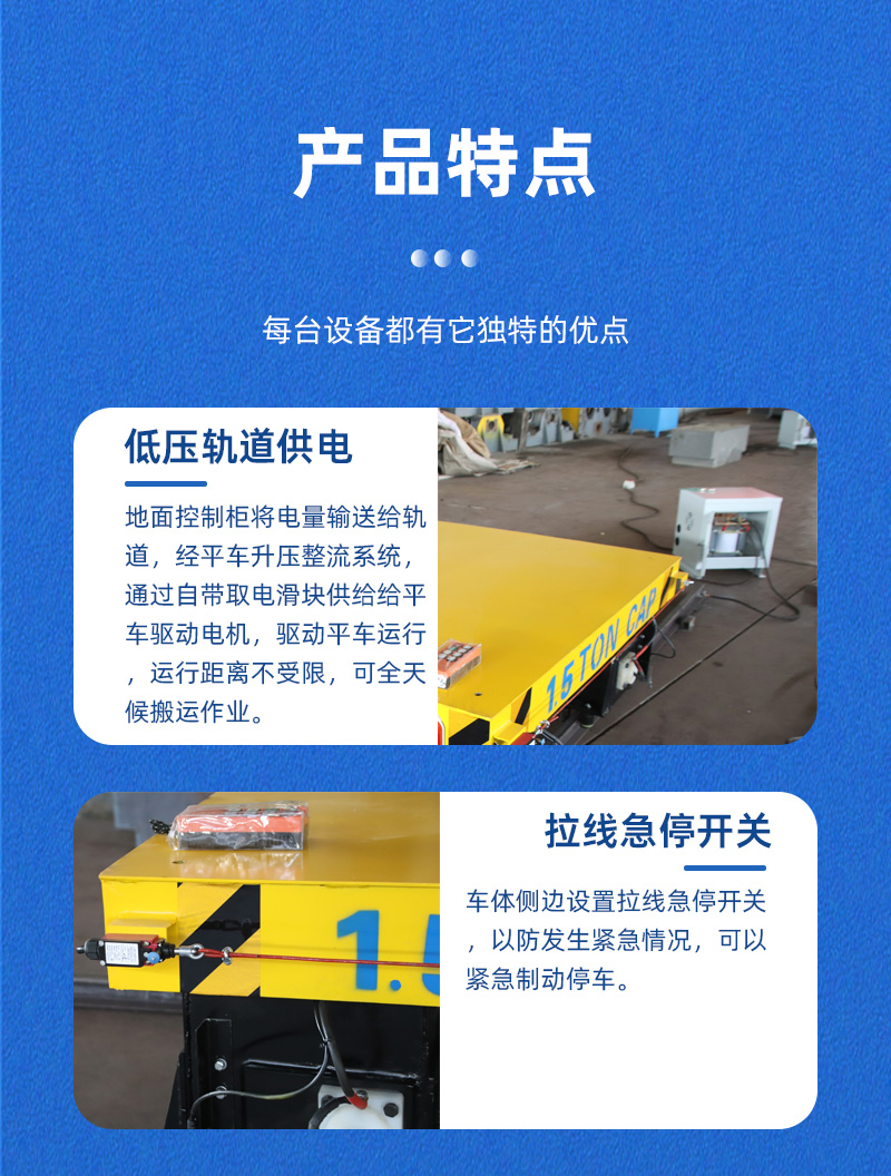 熱線:15517329551 轉(zhuǎn)彎軌道電動(dòng)平車,整車長(zhǎng)1.4米寬1.2米高0.5米載重1.5噸,采用低壓軌道供電方式為平車提供電力,通過地面控制柜將電纜線連接軌道,再經(jīng)平車升壓整流系統(tǒng)輸送給牽引電機(jī),驅(qū)動(dòng)平車運(yùn)行,車輪均做絕緣處理確保沒有觸電風(fēng)險(xiǎn),該種供電方式不受續(xù)航能力限制,可根據(jù)需要靈活調(diào)整線路及搬運(yùn)任務(wù),人工無線遙控操作,車體側(cè)邊設(shè)置拉線急停開關(guān),前后配備光電檢測(cè),確保行車安全。