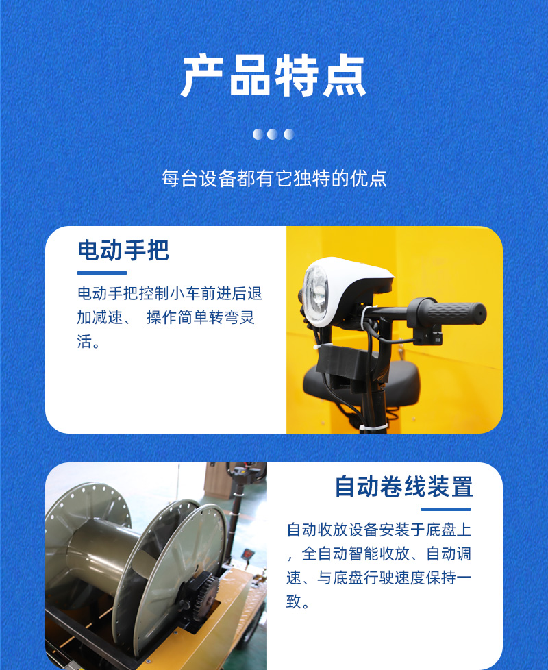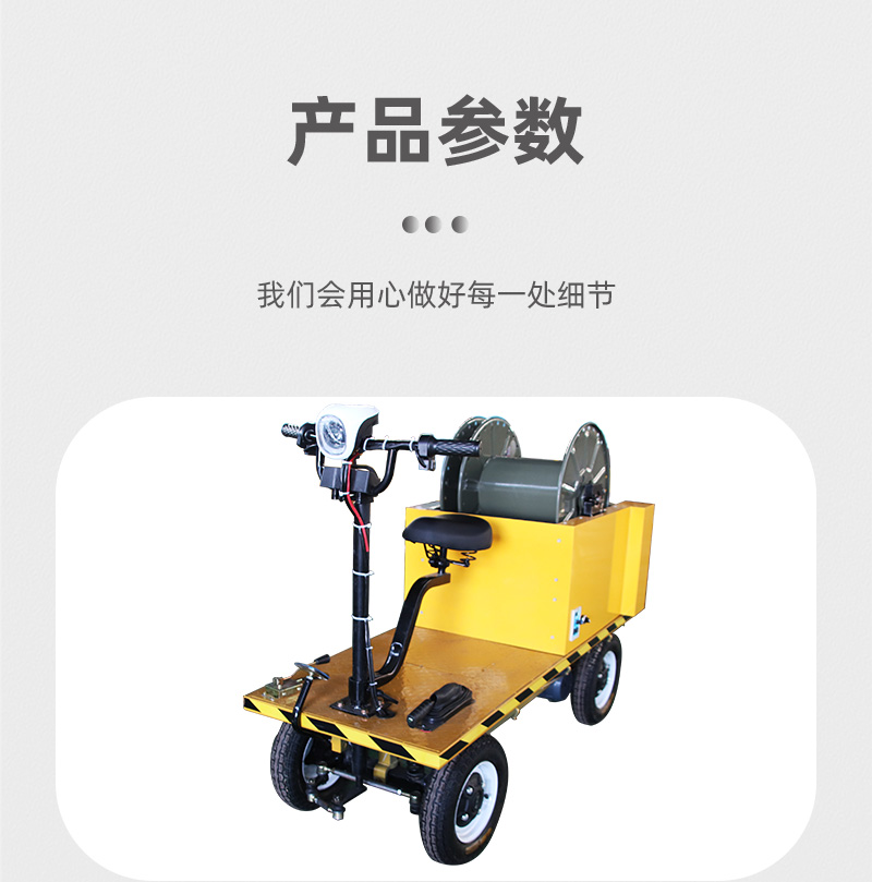 熱線:15517329551 全自動收放線無軌電動平板車,整車長1.5米寬0.6米高1.2米,四輪越野底盤,充氣橡膠輪胎、電動手把操控,蓄電池供電操作簡單運(yùn)行自由速度可控,橡膠輪胎能滿足顛簸路段、沙地等復(fù)雜路段行駛,小車后方裝有自動收放電纜線卷筒,全自動智能收放、自動調(diào)速自動擺線,卷筒速度可與小車行駛速度保持一致。