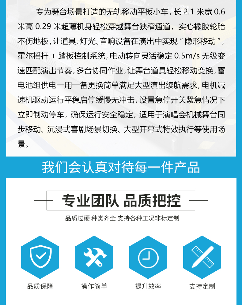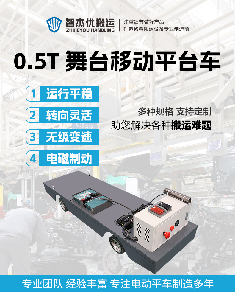 描   述: 專為舞臺(tái)場(chǎng)景打造的無軌移動(dòng)平板小車,長(zhǎng)2.1米寬0.6米高0.29米超薄機(jī)身輕松穿越舞臺(tái)狹窄通道,實(shí)心橡膠輪胎不傷地板,讓道具、燈光、音響設(shè)備在演出中實(shí)現(xiàn)“隱形移動(dòng)”,霍爾搖桿+電位器控制系統(tǒng),電動(dòng)轉(zhuǎn)向靈活穩(wěn)定0.5m/s無級(jí)變速匹配演出節(jié)奏,多臺(tái)協(xié)同作業(yè),讓舞臺(tái)道具輕松移動(dòng)變換,蓄電池組供電一用一備更換簡(jiǎn)單滿足大型演出續(xù)航需求,電機(jī)減速機(jī)驅(qū)動(dòng)運(yùn)行平穩(wěn)啟停緩慢無沖擊。