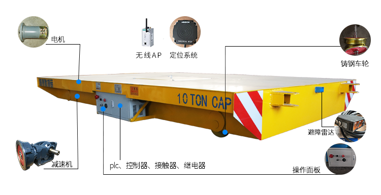 拖攬電動搬運車可改裝為電瓶直流供電方式供電,改為直流供電后不僅增加了安全,而且不怕燙,不怕砸,不妨礙交叉運輸,容易實現(xiàn)遙控和自動化,可以在彎道,環(huán)行道上行駛,適應增加降壓變壓器數(shù)量可不受平車運行距離的限制,給廠區(qū)運輸平面布置以很大方便,大大的增加了作業(yè)范圍。