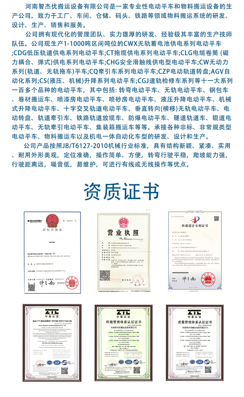 河南智杰優(yōu)搬運(yùn)設(shè)備有限公司以“質(zhì)量取勝,服務(wù)取勝”的經(jīng)營(yíng)理念,為了客戶的利益,公司建立了一整套快速的質(zhì)量信