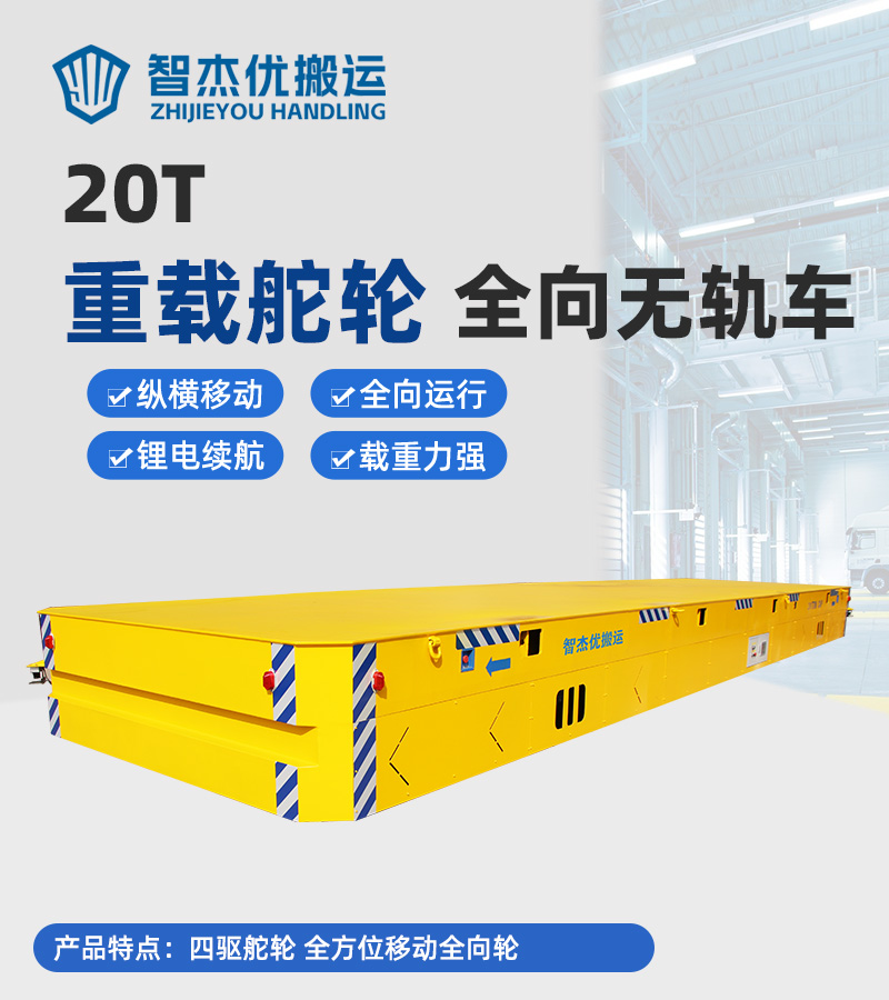 描   述: 智杰優(yōu)搬運為航運企業(yè)研發(fā)制造的重載舵輪全向無軌車,長12米寬2.8米高1米額定載重20噸,定制超長車身主要用于大型海洋工程裝備的轉(zhuǎn)運過跨。鋰電池供電、輪系配備四組舵輪,可實現(xiàn)全方位移動搬運作業(yè)。