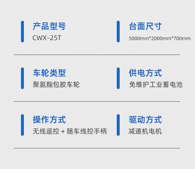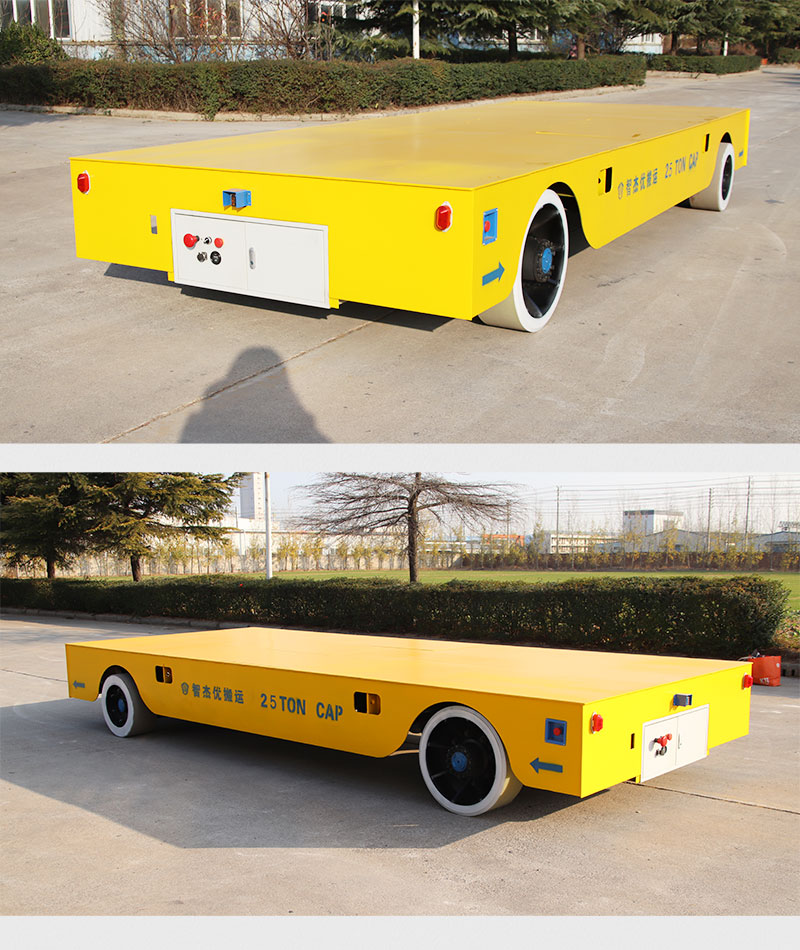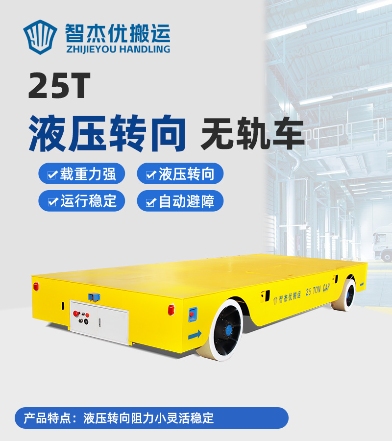 描   述: 智杰優(yōu)搬運為金屬制造業(yè)設計生產(chǎn)的鋼板運輸無軌地平車,長5米寬2米高0.7米額定載重25噸,應用于跨車間鋼板、鋼材的成品及原料轉(zhuǎn)運作業(yè)。該車為免維護蓄電池供電空滿載交替運行時間不低于6小時,配備智能充電機電流平穩(wěn)充滿自動斷電,大功率電機自帶編碼器,可以***控制電機轉(zhuǎn)動,實現(xiàn)高精度的運動控制,無線遙控操作前進后退左轉(zhuǎn)右轉(zhuǎn),轉(zhuǎn)彎方式采用液壓轉(zhuǎn)向,操縱輕便靈活動態(tài)響應性好,方便跨車間的物料轉(zhuǎn)運,聚氨酯包膠