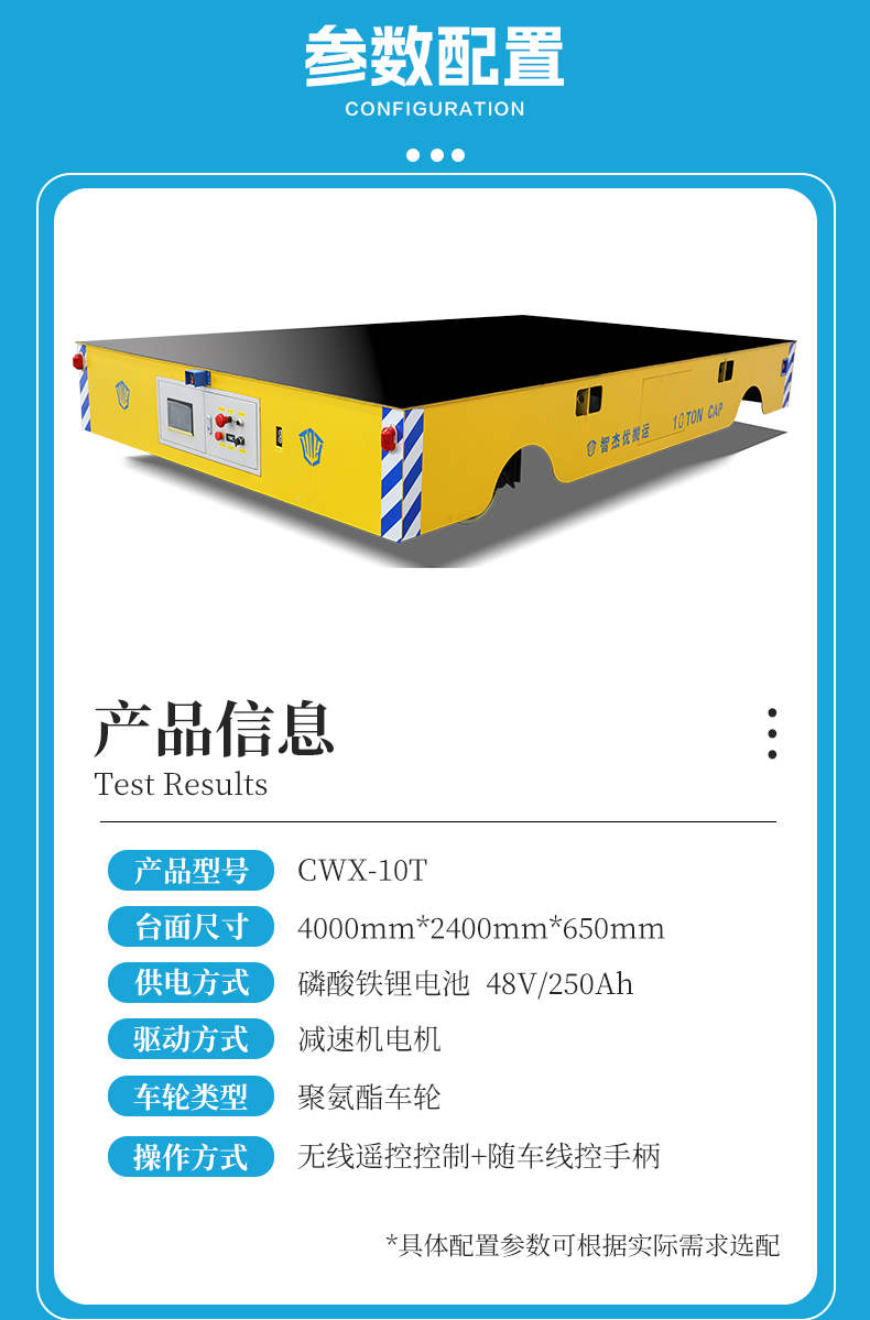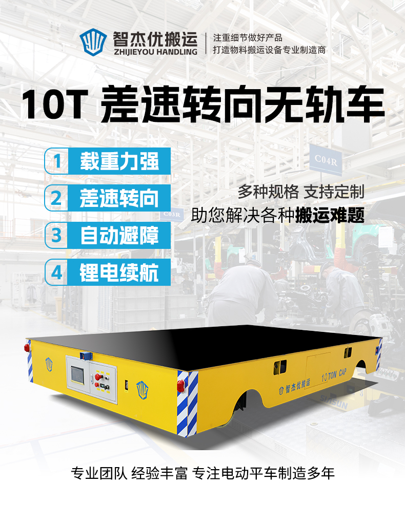 描   述: 工件搬運無軌車車間運輸平板車長4米寬2.4米高0.65米,車架箱梁結(jié)構(gòu)結(jié)實耐用可搬運10噸的貨物。臺面安裝橡膠防滑墊,鋰電池供電續(xù)航時間長,人機交互顯示屏實時顯示車輛狀態(tài)故障信息,可手動調(diào)節(jié)平車參數(shù)功能設(shè)置。