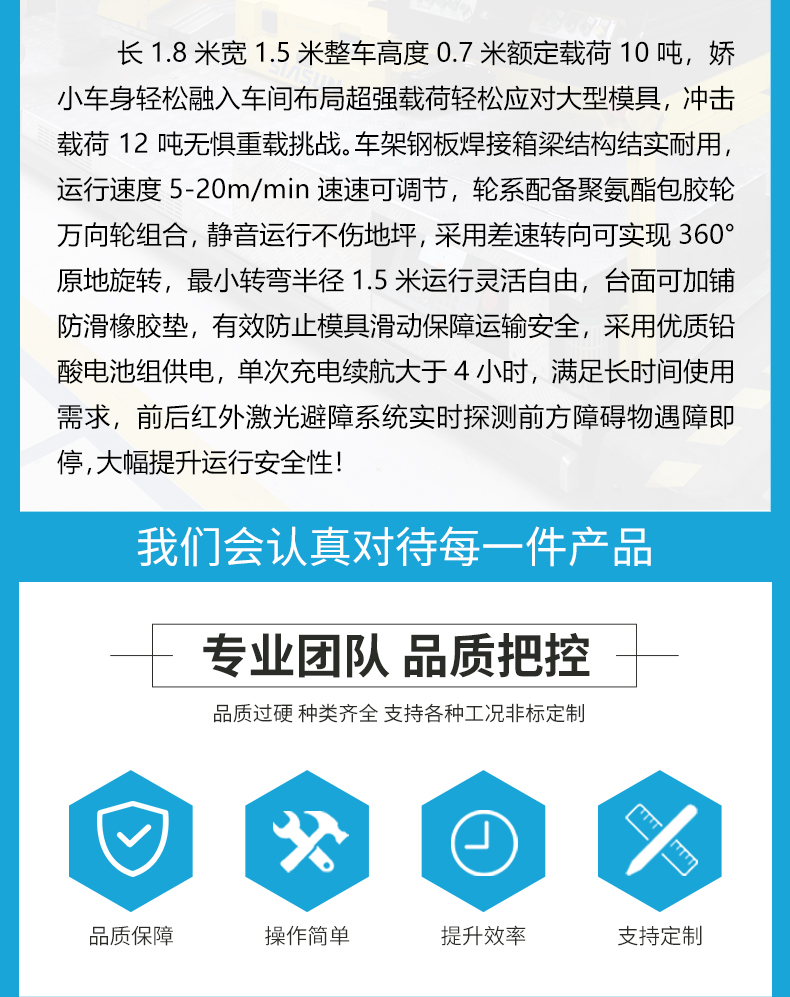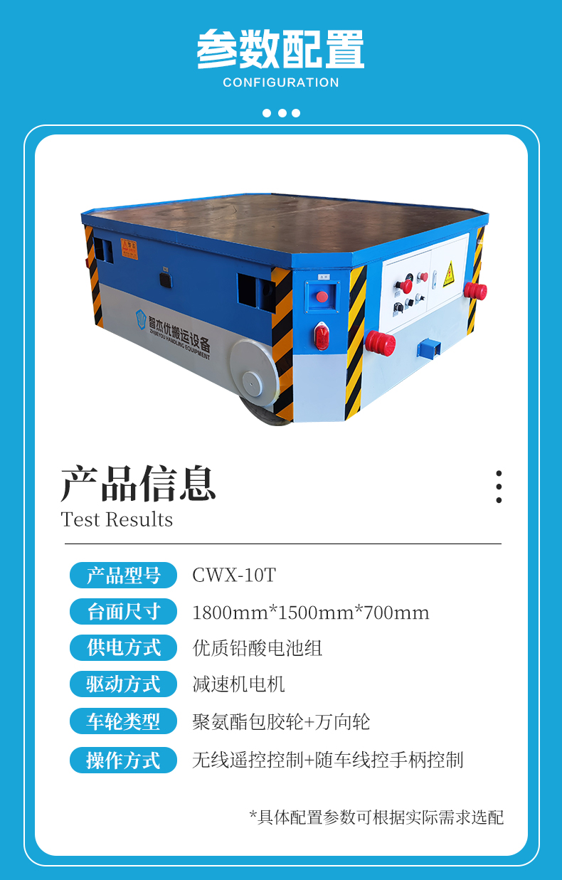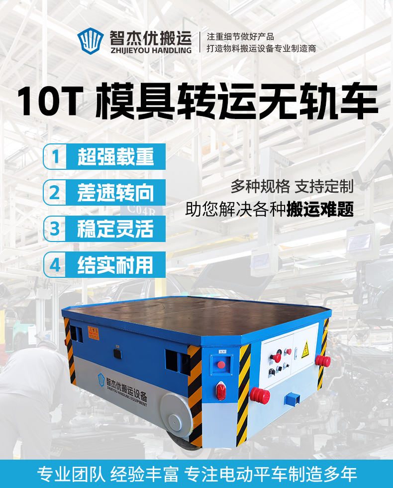 描   述: 在繁忙的汽車零部件生產(chǎn)車間,重型模具的***、高效、安全轉(zhuǎn)運是提升效率的關(guān)鍵環(huán)節(jié),智杰優(yōu)專為模具轉(zhuǎn)運定制的差速轉(zhuǎn)向無軌車,以1.8米*1.5米*1.7米緊湊車身,10噸級超大載荷,差速轉(zhuǎn)向***靈活,安全可靠與超長續(xù)航于一身,是您車間內(nèi)物料搬運的得力助手!