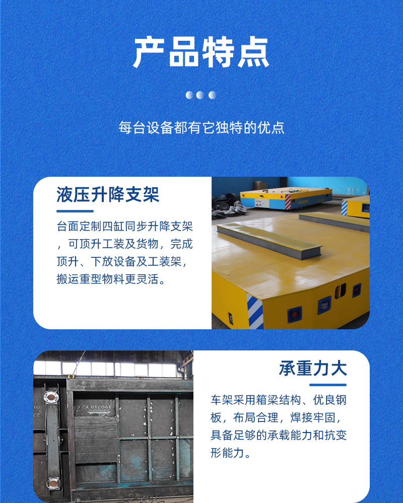 熱線:15517329551 這是一臺液壓升降全向無軌車客戶使用現(xiàn)場,長3.5米寬3米高0.55米額定載重40噸,主要用于車間內(nèi)風(fēng)電設(shè)備部件的轉(zhuǎn)運(yùn)作業(yè)。電機(jī)減速機(jī)驅(qū)動(dòng)平車運(yùn)行,蓄電池供電運(yùn)行路線不受線纜限制,臺面定制液壓升降支架,可頂升工裝架,升降行程200mm,輪系采用聚氨酯包膠輪搭配萬向輪可實(shí)現(xiàn)全向運(yùn)行,車間柱子阻礙下也能靈活調(diào)整方向輕松通過。無線搖桿操作控制平車運(yùn)行及升降,可鉆入工裝下,完成頂升、運(yùn)輸、下放工裝等動(dòng)作,車體四周設(shè)有防撞滑塊,急停開關(guān),前后安裝270度避障雷達(dá),遇障即停,確保全向車安全往返運(yùn)輸作業(yè)!