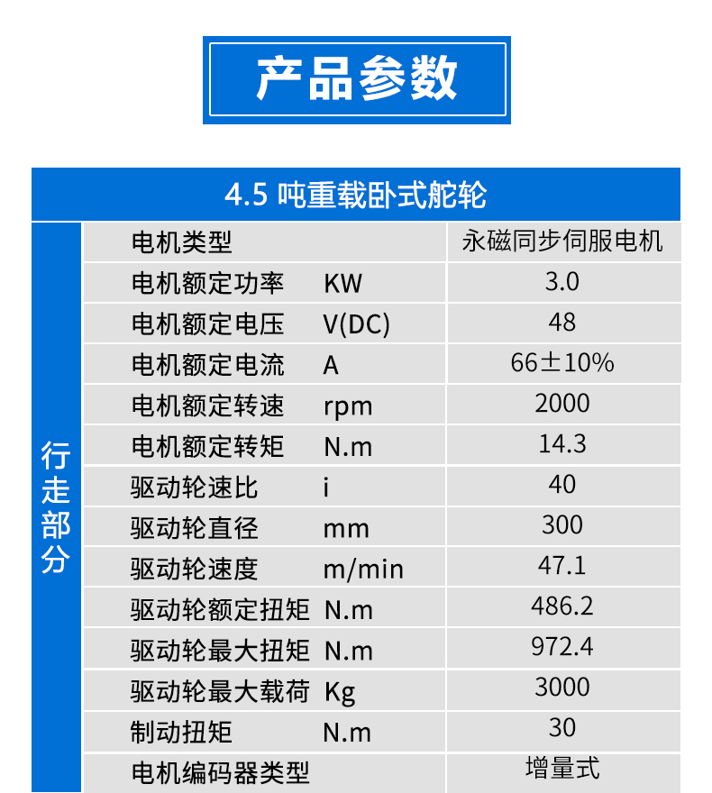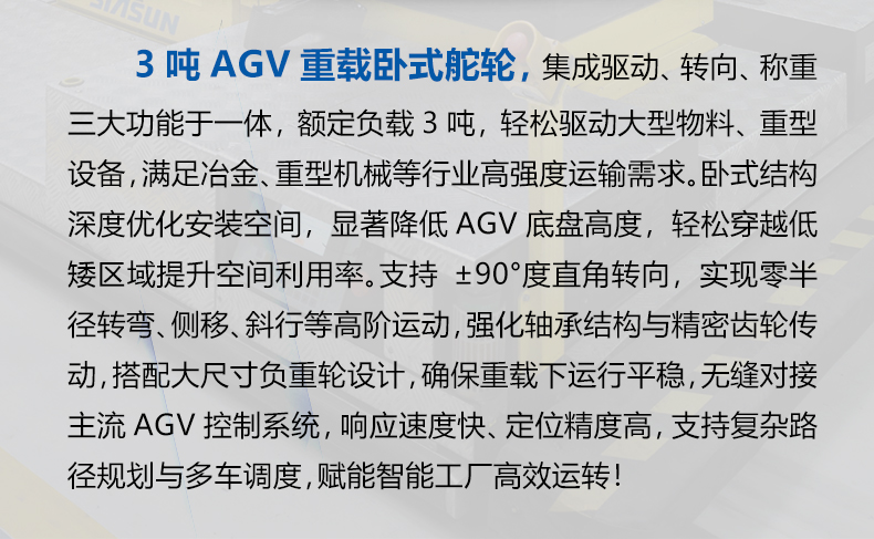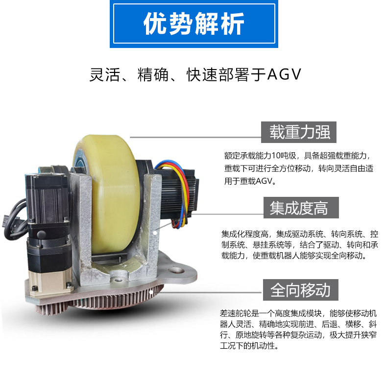 描   述: 3噸AGV重載臥式舵輪,車輪直徑30厘米載重3噸,集成了驅(qū)動(dòng)、轉(zhuǎn)向和制動(dòng)等多種功能于一體,適配性強(qiáng),精度高,采用***的伺服電機(jī)及編碼器技術(shù),能夠?qū)崿F(xiàn)***的轉(zhuǎn)矩控制和轉(zhuǎn)向控制,確保車輛在運(yùn)行中的穩(wěn)定性和準(zhǔn)確性,可快速部署在AGV小車上實(shí)現(xiàn)全向行駛、縱橫移動(dòng)、米字行走、原地旋轉(zhuǎn)等動(dòng)作。舵輪行走機(jī)構(gòu)是AGV實(shí)現(xiàn)自主移動(dòng)和***導(dǎo)航的重要組成部分。