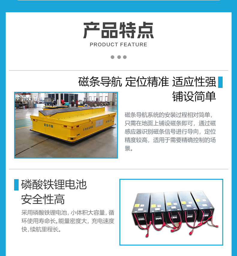 描   述: 智杰優(yōu)搬運(yùn)為管道制造業(yè)研發(fā)生產(chǎn)的35噸重載AGV,平臺(tái)長(zhǎng)4.5米寬2.8米高0.9米額定載重35噸,客戶主要用于大型鋼管的搬運(yùn)作業(yè)。臺(tái)面定制V型置物架設(shè)置橡膠防滑墊增加接觸面積,防止鋼管在運(yùn)輸過(guò)程中滾落。該車采用磁條導(dǎo)航,根據(jù)地面鋪設(shè)磁條進(jìn)行循跡行走,運(yùn)行路線設(shè)置AB兩個(gè)站點(diǎn),可通過(guò)操作按鈕自動(dòng)運(yùn)行至A站或B站,也可通過(guò)無(wú)線遙控操作AGV搬運(yùn)車運(yùn)行,輪系配備四組雙差速舵輪,伺服電機(jī)行星減速機(jī)***控