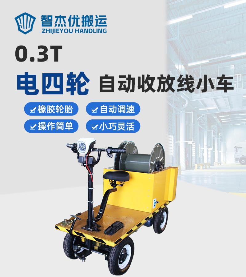熱線:15517329551 全自動收放線無軌電動平板車,整車長1.5米寬0.6米高1.2米,四輪越野底盤,充氣橡膠輪胎、電動手把操控,蓄電池供電操作簡單運(yùn)行自由速度可控,橡膠輪胎能滿足顛簸路段、沙地等復(fù)雜路段行駛,小車后方裝有自動收放電纜線卷筒,全自動智能收放、自動調(diào)速自動擺線,卷筒速度可與小車行駛速度保持一致。