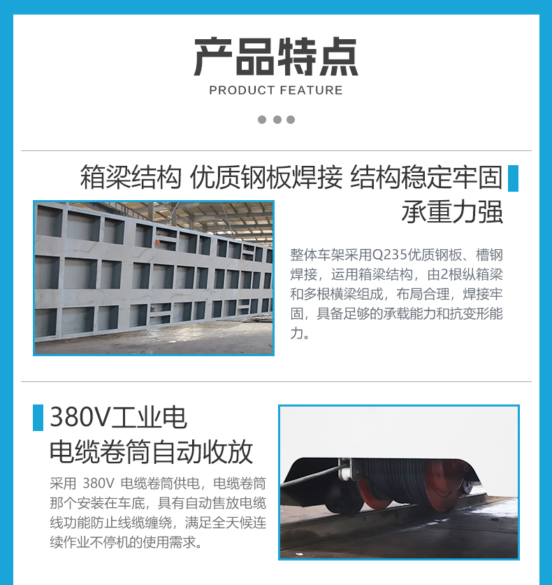 描   述: 重型電纜卷筒軌道平車,專為應(yīng)對(duì)高溫鑄件轉(zhuǎn)運(yùn)嚴(yán)苛工況設(shè)計(jì),長(zhǎng)4米寬2.5米高0.65米額定載荷30噸,車架箱梁結(jié)構(gòu)不易變形,臺(tái)面鋪設(shè)耐火磚形成堅(jiān)固耐熱保護(hù)層,有效隔絕高溫鑄件熱輻射,保護(hù)車體結(jié)構(gòu)延長(zhǎng)使用壽命。電纜卷筒供電,卷筒安裝在平車底部自動(dòng)收放電纜線,優(yōu)化空間同時(shí)滿足全天候連續(xù)作業(yè)不停機(jī),顯著縮短鑄件過(guò)跨時(shí)間,生產(chǎn)效率直線飆升,平車前后配備光電傳感器自動(dòng)識(shí)別障礙物自動(dòng)避障,大幅降低碰撞事故風(fēng)險(xiǎn)!