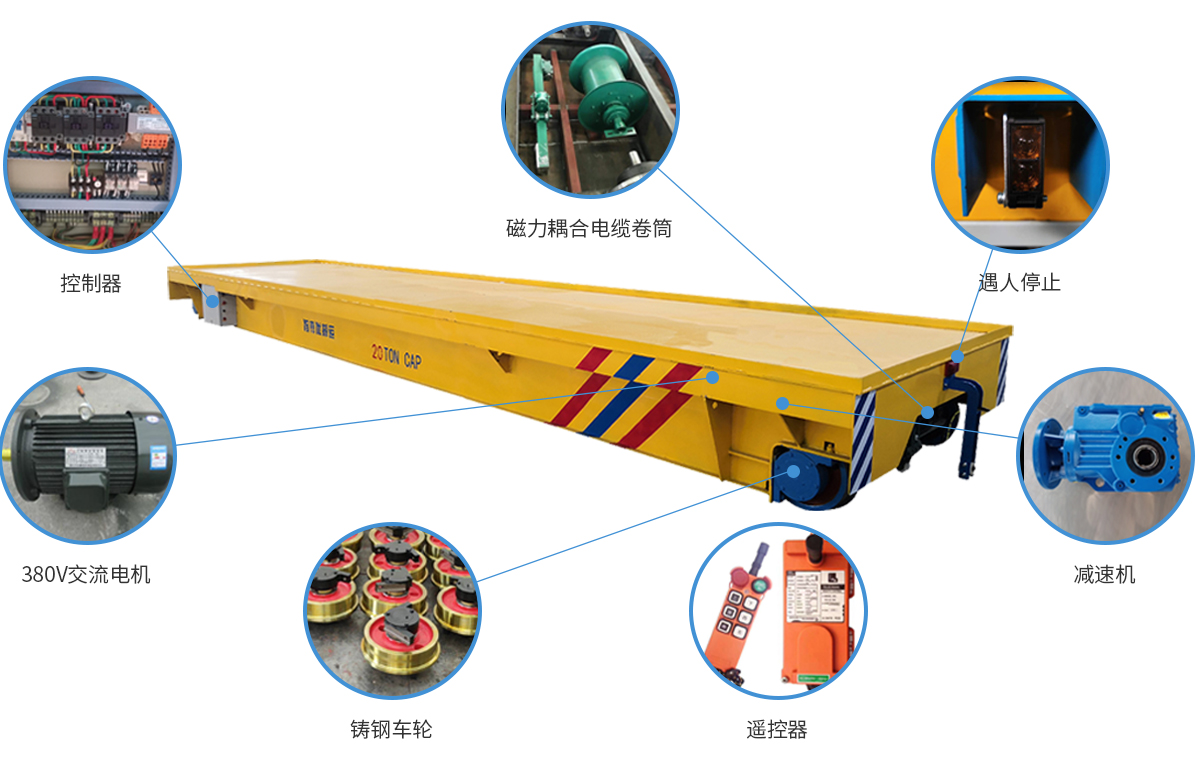 CJG系列電纜卷筒供電電動平車,適將AC380V交流電源通過電纜線供給給牽引電機(jī),通過控制系統(tǒng)控制電機(jī)的啟動、停止、前進(jìn)、后退等。操作系統(tǒng)電壓為安全電壓36V。電纜線依靠轉(zhuǎn)運車的卷線裝置來收放電纜線,卷線裝置安裝在電動平車的下方,可加裝PLC系統(tǒng)實現(xiàn)全自動化控制。該系列車適用于環(huán)境惡劣、高溫環(huán)境、防爆環(huán)境等,由于機(jī)構(gòu)比較簡單,成本較低,是車間過跨較常見等電動平車;相對于蓄一電池電動平車,其使用時間不受限,相對于低壓軌道供電電動平車,對于軌道鋪設(shè)要求不高。該系列車適用于任意載重量、使用頻率較高等場合,如果運行距離超過50米,需要增設(shè)布線器來輔助卷線,運行距離可以滿足200米。
