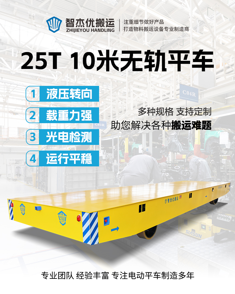 熱線:15517329551 10米無(wú)軌搬運(yùn)車(chē)設(shè)備運(yùn)輸平板車(chē),整車(chē)長(zhǎng)10米寬2.5米高0.95米額定載重25噸,主要用于大型涂裝設(shè)備的跨車(chē)間轉(zhuǎn)運(yùn)作業(yè)。車(chē)體尺寸根據(jù)物料大小一對(duì)一定制,車(chē)架箱梁結(jié)構(gòu)鋼板焊接穩(wěn)定牢固載重力強(qiáng)不易變形,耐摔耐砸扛造,蓄電池供電節(jié)能環(huán)保,無(wú)線遙控控制平車(chē)前進(jìn)后退、左轉(zhuǎn)右轉(zhuǎn),速度可調(diào)節(jié)。減速機(jī)電機(jī)車(chē)橋驅(qū)動(dòng)結(jié)構(gòu)緊湊傳動(dòng)效率高、液壓轉(zhuǎn)向穩(wěn)定靈活,大直徑聚氨酯包膠輪適應(yīng)多種地面運(yùn)行,該車(chē)設(shè)計(jì)可爬15度的坡進(jìn)行室外運(yùn)行,光電檢測(cè)遇到障礙自動(dòng)停車(chē)安全性高,該系列電動(dòng)平車(chē)結(jié)構(gòu)簡(jiǎn)單、故障率低、維護(hù)簡(jiǎn)單,是車(chē)間內(nèi)高效率的搬運(yùn)工具,可進(jìn)行深度化定制!