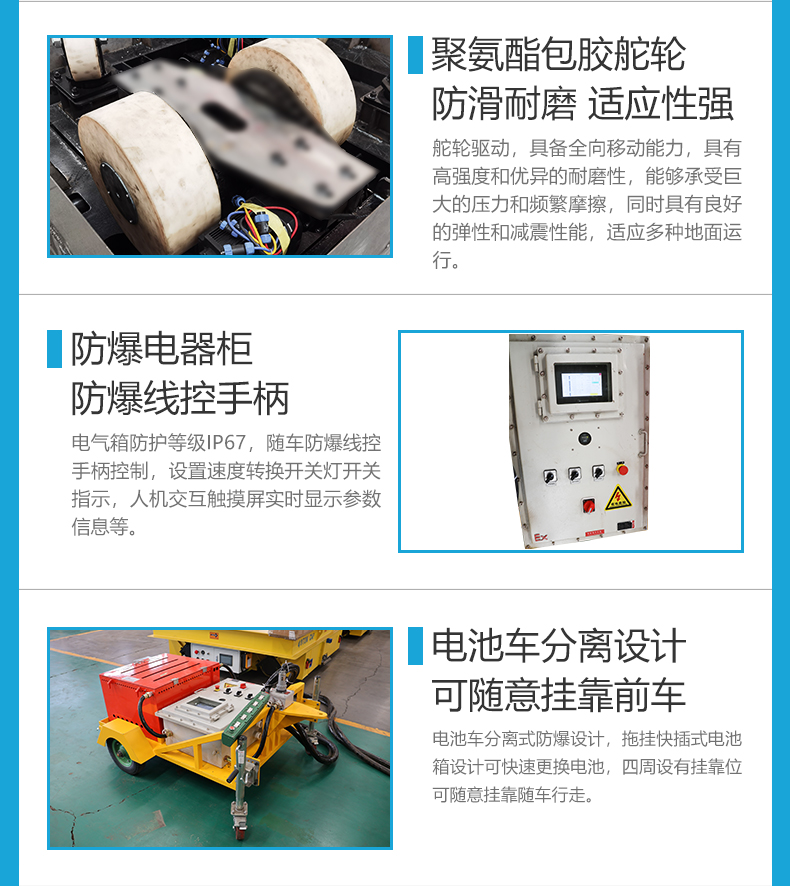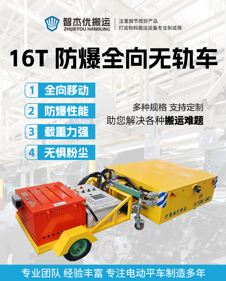 描   述: 防爆蓄電池全向移動無軌車,1.8米*0.6米*0.7米緊湊車身16噸***載重能力,整車304不銹鋼材質(zhì)耐腐蝕抗沖擊,搭配防爆電柜箱與防爆隨車線控手柄,電池車分離式防爆設(shè)計(jì),拖掛快插式電池箱設(shè)計(jì)可快速更換電池,四周設(shè)有掛靠位可隨意掛靠隨車行走,舵輪+萬向輪組合配合伺服電機(jī)行星減速機(jī)驅(qū)動,支持全向移動、縱橫平移、原地旋轉(zhuǎn),機(jī)械自動調(diào)平功能,極限爬坡7°,IP67防護(hù)等級無懼粉塵潮濕環(huán)境,防爆設(shè)計(jì)