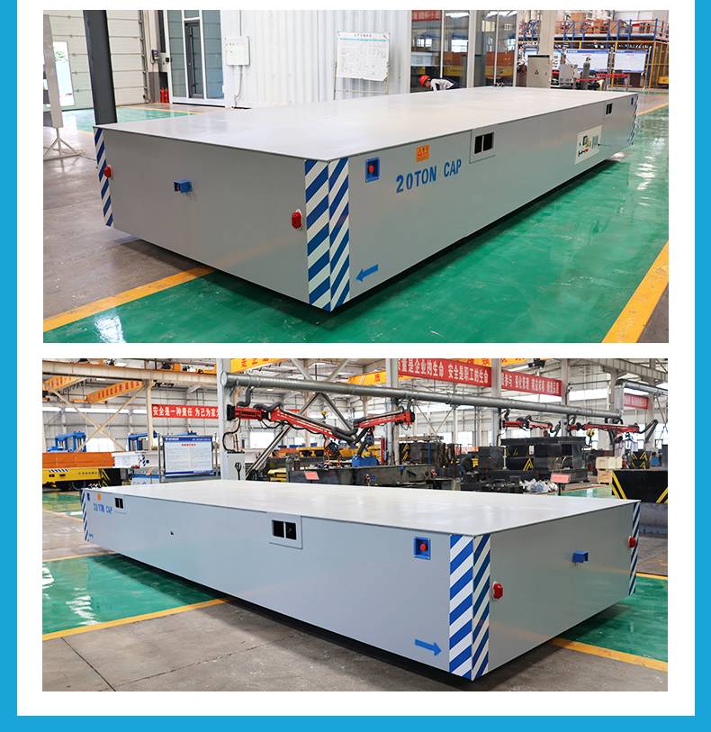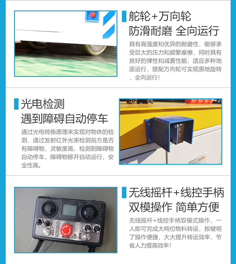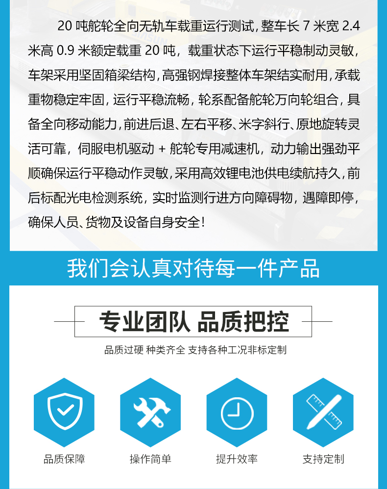 描   述: 20噸全向移動無軌平板車,7米*2.4米寬大平臺0.9米定制高度,高強鋼焊接穩(wěn)定牢固輕松承載重型設(shè)備、大型模具,輪系配備2個高性能聚氨酯包膠舵輪+2個萬向輪組合,配合精密伺服電機減速機驅(qū)動動力澎湃輸出穩(wěn)定,集前進后退、左右轉(zhuǎn)彎、縱橫移動、米字斜行、原地旋轉(zhuǎn)于一身,聚氨酯材質(zhì)耐磨靜音不傷地面。無線搖桿+有線手柄兩種操作模式簡單方便上手快,光電檢測系統(tǒng)實時掃描障礙物,遇障自動停車確保貨物人員安全。