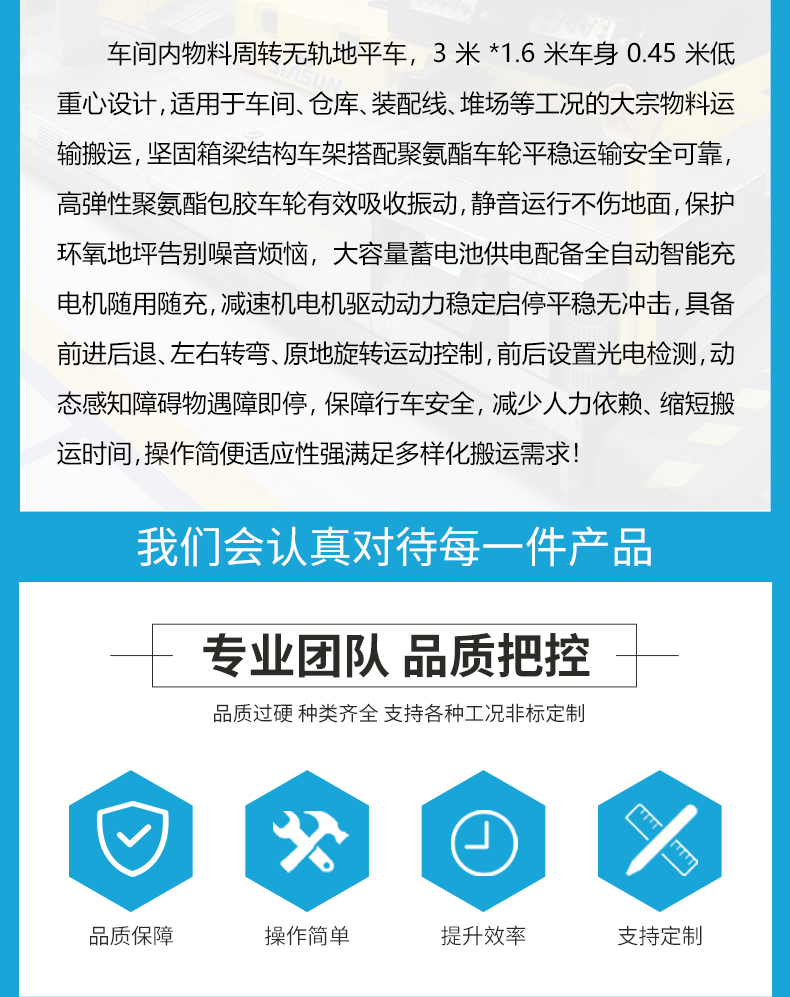 描   述: 車間內(nèi)物料周轉(zhuǎn)無軌地平車,3米*1.6米車身0.45米低重心設(shè)計,適用于車間、倉庫、裝配線、堆場等工況的大宗物料運輸搬運,堅固箱梁結(jié)構(gòu)車架搭配聚氨酯車輪平穩(wěn)運輸安全可靠,靜音運行不傷地面保護環(huán)氧地坪告別噪音煩惱,蓄電池供電配備全自動智能充電機隨用隨充,減速機電機驅(qū)動動力穩(wěn)定啟停平穩(wěn)無沖擊,具備前進后退、左右轉(zhuǎn)彎、原地旋轉(zhuǎn)運動控制,光電檢測動態(tài)感知障礙物遇障即停,保障行車安全,減少人力依賴、縮短搬運