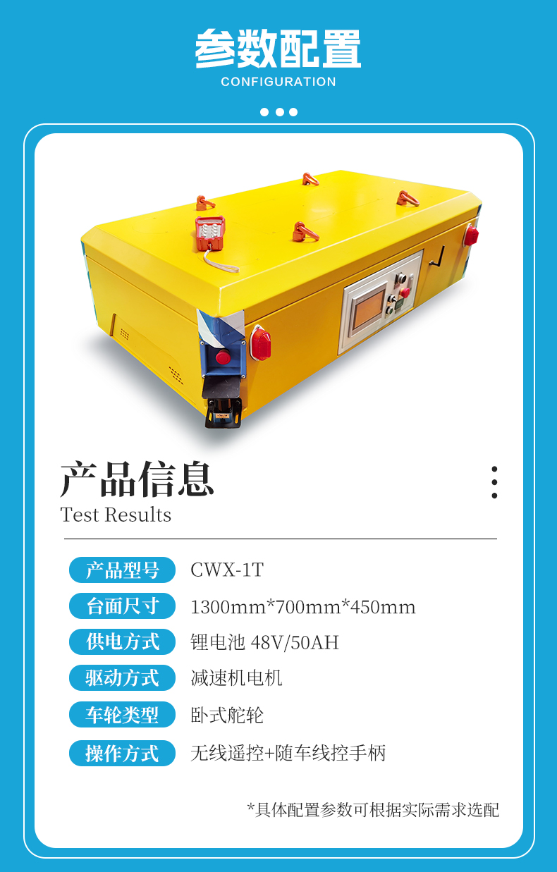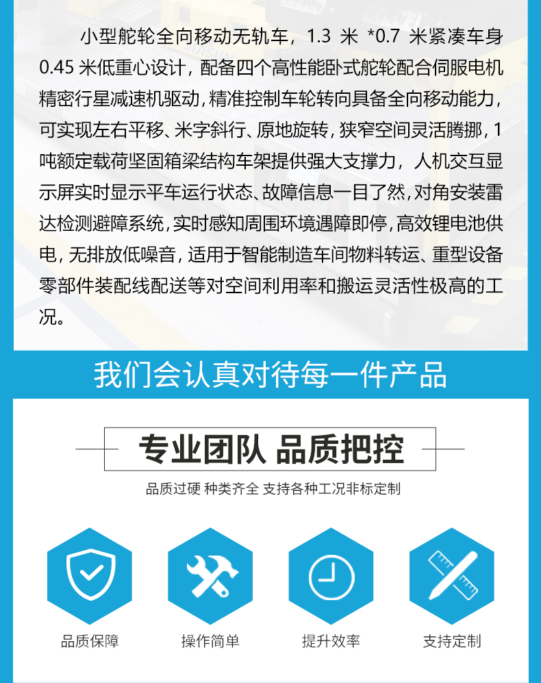 描   述: 小型舵輪全向移動無軌車,1.3米*0.7米緊湊車身0.45米低重心設(shè)計(jì),配備四個高性能臥式舵輪配合伺服電機(jī)精密行星減速機(jī)驅(qū)動,***控制車輪轉(zhuǎn)向具備全向移動能力,可實(shí)現(xiàn)左右平移、米字斜行、原地旋轉(zhuǎn),狹窄空間靈活騰挪,1噸額定載荷堅(jiān)固箱梁結(jié)構(gòu)車架提供強(qiáng)大支撐力,人機(jī)交互顯示屏實(shí)時顯示平車運(yùn)行狀態(tài)、故障信息一目了然,雷達(dá)檢測避障系統(tǒng)實(shí)時感知周圍環(huán)境遇障即停,高效鋰電池供電無排放更環(huán)保,適用于智能制造車間