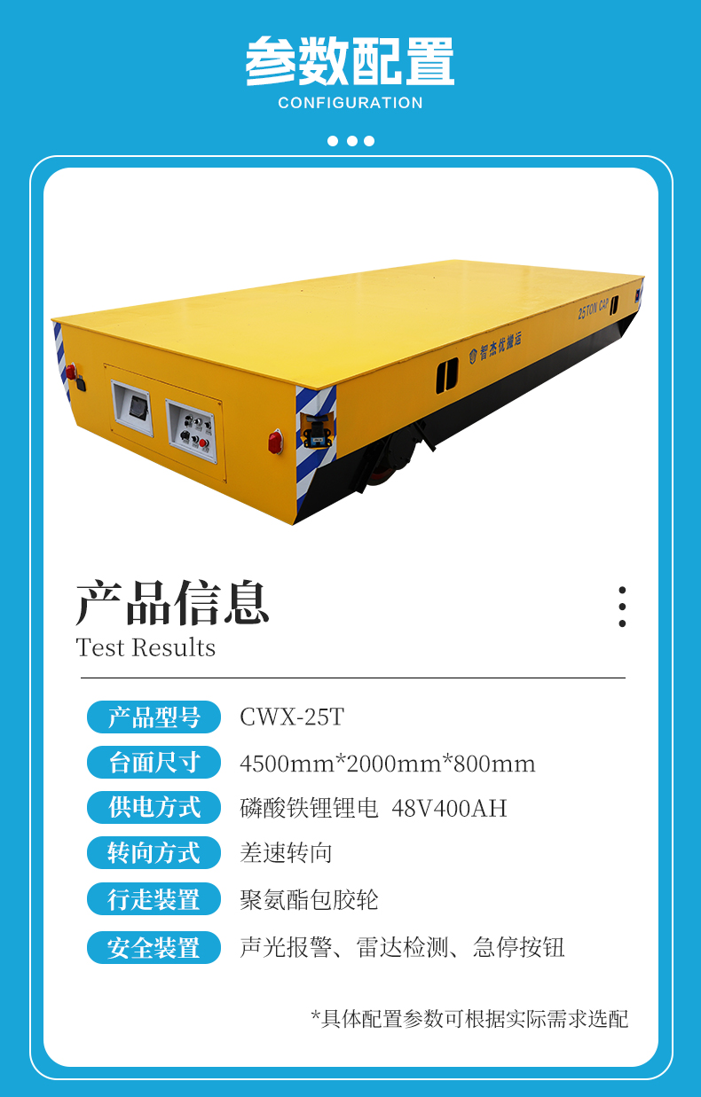 描   述: 25噸蓄電池差速轉(zhuǎn)向無軌轉(zhuǎn)運(yùn)車,搭載48V400安時(shí)大容量鋰電池組,續(xù)航持久滿足長(zhǎng)時(shí)間作業(yè)需求,差速轉(zhuǎn)向轉(zhuǎn)彎靈活可進(jìn)行極小半徑原地旋轉(zhuǎn),對(duì)角安裝270°大范圍雷達(dá)避障檢測(cè)到障礙物立即停車,為重型機(jī)械制造車間物料轉(zhuǎn)運(yùn)、模具運(yùn)輸、零部件配送等工業(yè)環(huán)境提供穩(wěn)定承載與安全轉(zhuǎn)運(yùn)解決方案!
