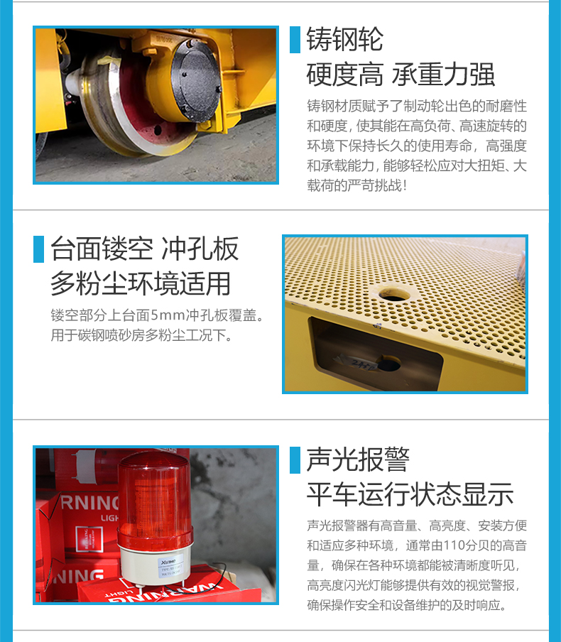 描   述: 噴拋一體房專(zhuān)用軌道平板車(chē),5米*2.5米寬大平臺(tái),匹配10噸額定載重,輕松應(yīng)對(duì)工件、機(jī)械設(shè)備及批量物料的轉(zhuǎn)運(yùn)需求。0.5米低重心設(shè)計(jì)運(yùn)行平穩(wěn)無(wú)傾覆風(fēng)險(xiǎn),保障作業(yè)安全。臺(tái)面5mm沖孔板覆蓋鏤空區(qū)域,蜂窩狀孔洞設(shè)計(jì),快速排水排屑,防滑防積塵,適應(yīng)噴拋、清洗等濕滑工況。減速機(jī)電機(jī)驅(qū)動(dòng),啟停平穩(wěn)無(wú)沖擊。