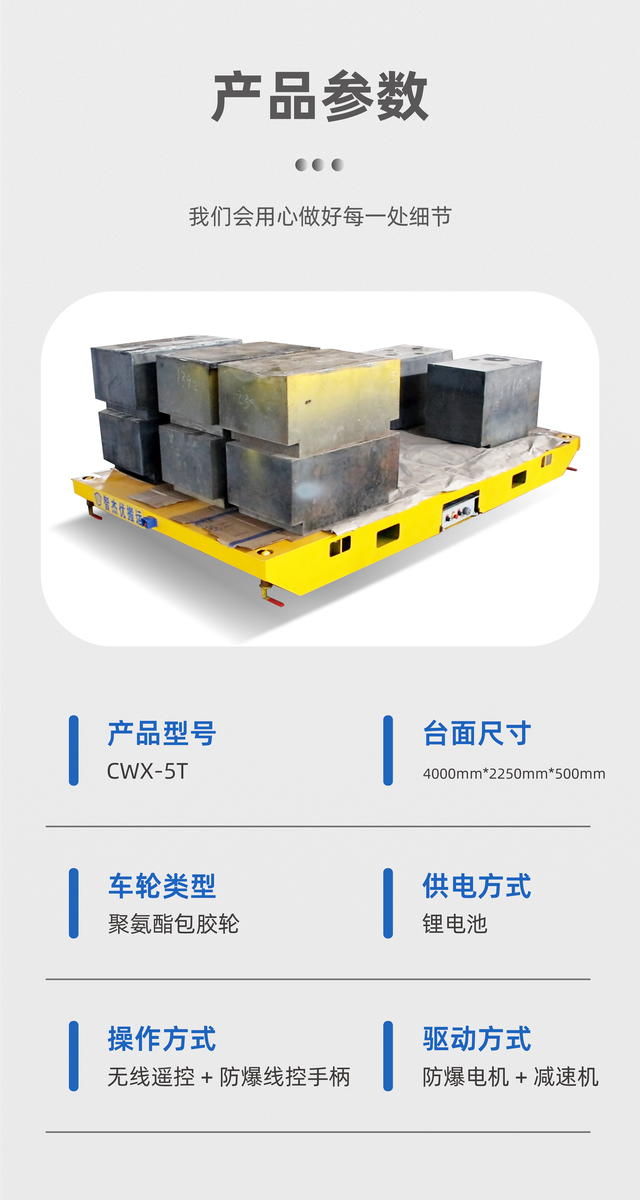 描   述: 集裝箱搬運(yùn)無軌電動平車,整車長4米 寬2.25米高0.5米,載重5噸,鋰電池供電續(xù)航里程長,載重滿負(fù)荷運(yùn)行2.2小時,箱梁結(jié)構(gòu)穩(wěn)定牢固,臺面焊接集裝箱專用對碼鎖,確保貨物安全;聚氨酯包膠萬向車輪,彈性好防滑耐磨轉(zhuǎn)向靈活,無線遙控平車前進(jìn)后退,左右轉(zhuǎn)彎原地旋轉(zhuǎn),防爆電氣箱、防爆操作手柄均達(dá)國家防爆要求,前后光電檢測自動避障。