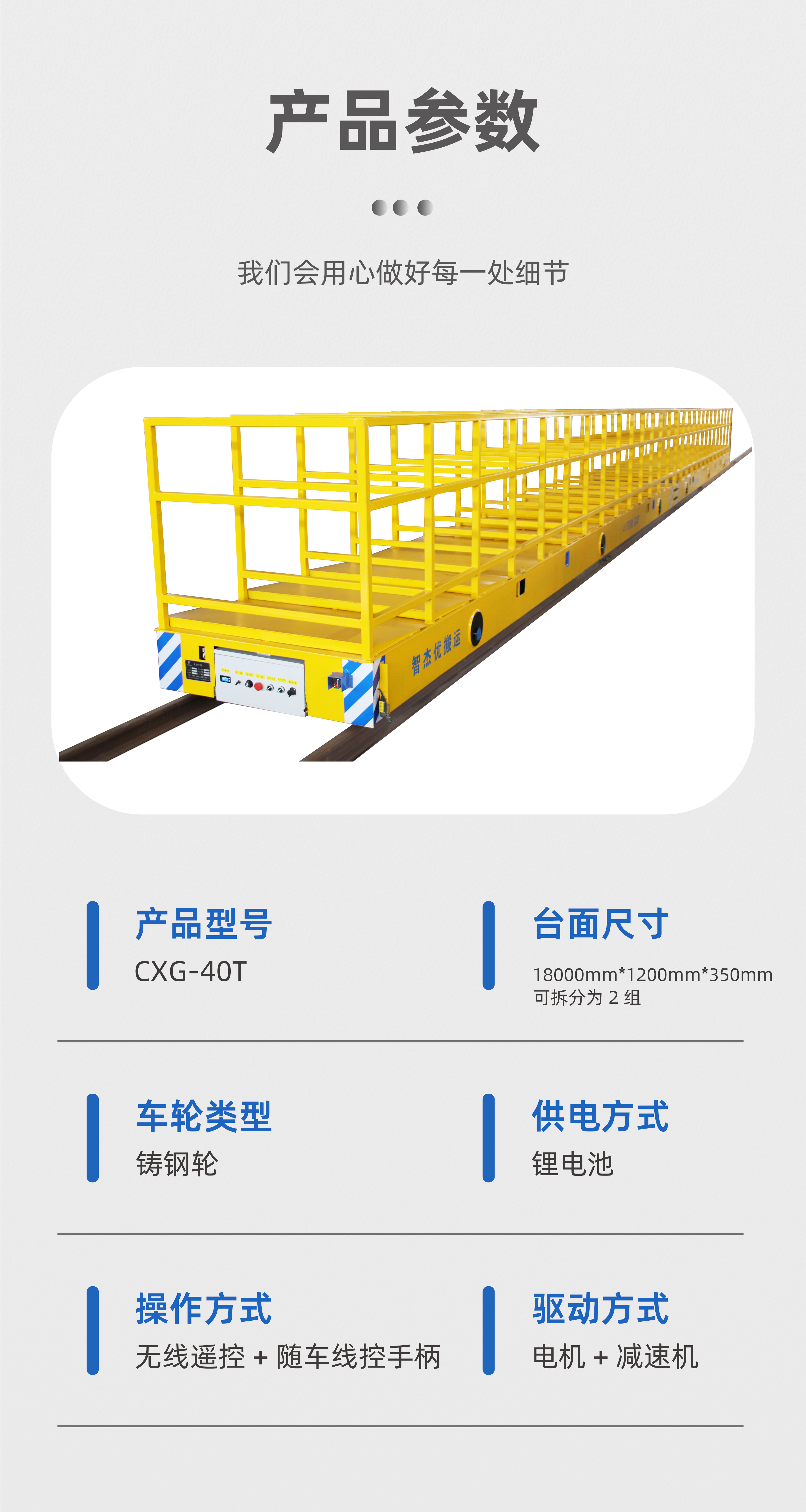 描   述: 該車長18米,寬1.2米,高0.35米,車體可拆分為兩組,車架箱梁焊接,承重能力強(qiáng)可載重40噸,平臺上方設(shè)有單獨(dú)工位,每個工位載重1.5噸,方鋼柵欄方便物料擺放,臺面坡度設(shè)計防止貨物傾斜滑落,大扭矩減速機(jī)電機(jī)驅(qū)動,配有6組主動輪,驅(qū)動力大,啟動力足,啟停平穩(wěn),電磁制動,性能突出,響應(yīng)靈敏,無線遙控平車前進(jìn)后退、加減速,設(shè)有限位傳感器到達(dá)地點自動停車,前后光電感應(yīng)遇障自停,聲光報警保障安全。